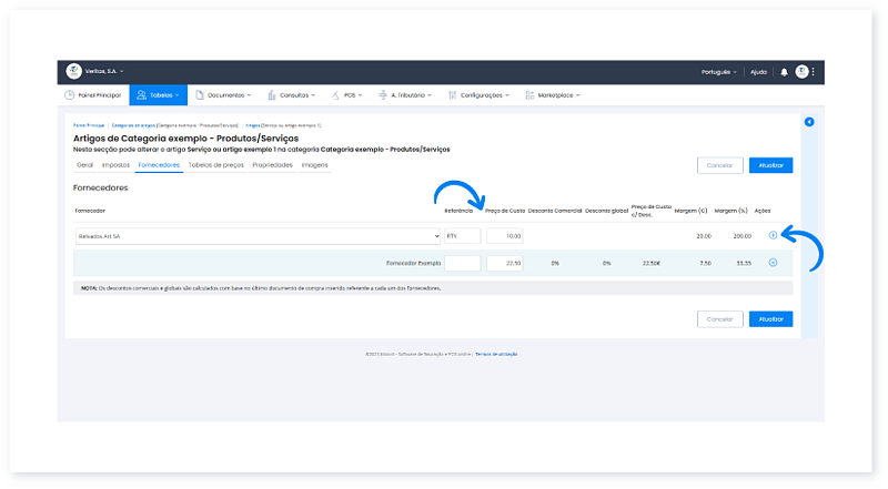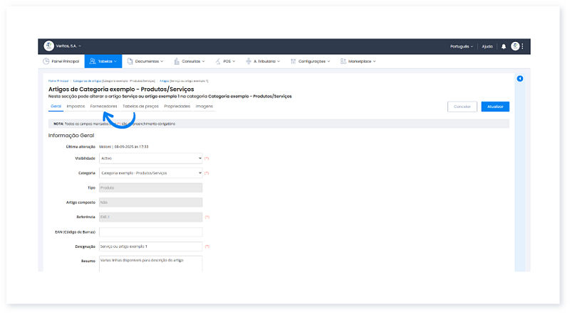 A associação de um fornecedor ao artigo pode ser feita no momento da criação, ou mais tarde, através da ação de Editar.