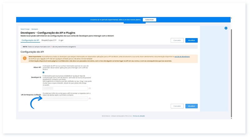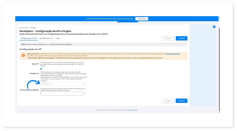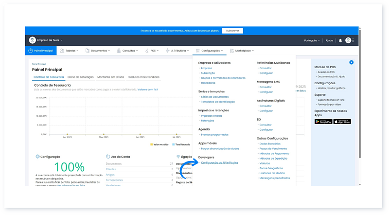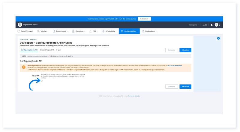 11. Na área de cliente Moloni, aceda ao menu Configurações, e clique em Configuração da API e Plugins.