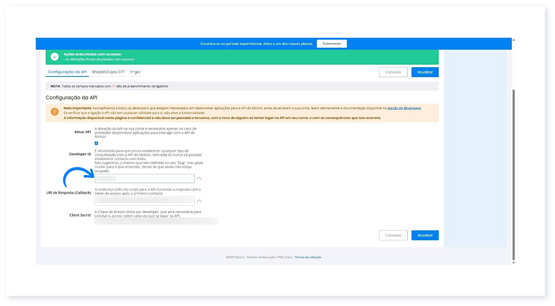 16. De seguida, clique em Atualizar. É fornecido o Developer ID e o Client Secret que deve copiar e colar no formulário Wix.