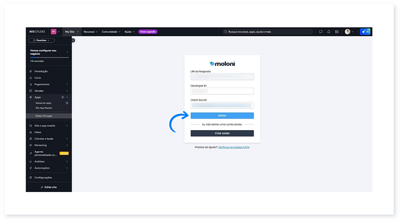 10. Caso tenha a API configurada, insira os dados e clique em Entrar. Caso contrário, siga os passos seguintes.