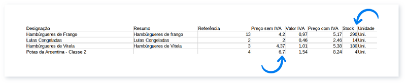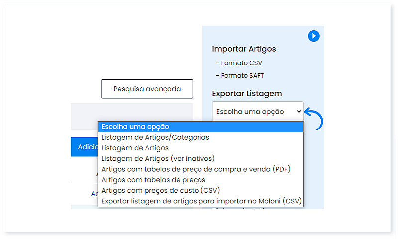 Os seus artigos podem ser exportados para uma listagem em CSV, podendo apenas exportar artigos de determinada categoria. Pode exportar uma lista com todos os artigos e voltar a ser importada para outra conta no Moloni.
