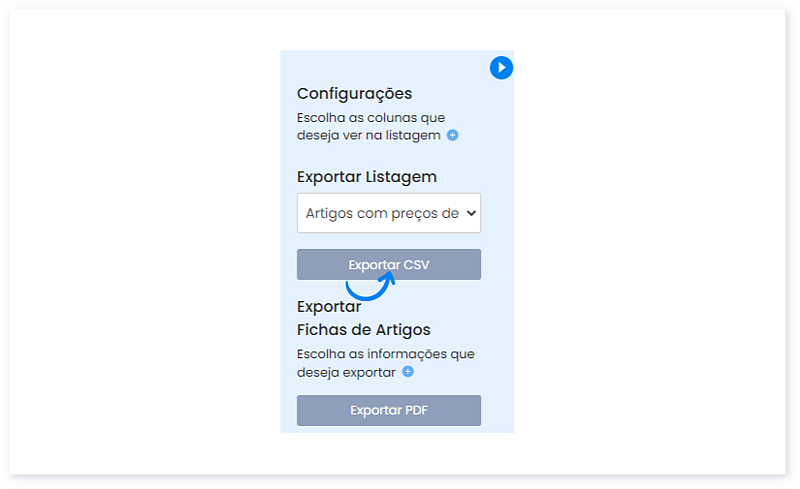 Tal como nas listagens PDF, é possível exportar para CSV apenas os artigos de uma determinada categoria e escolher as colunas que fazem parte do documento.