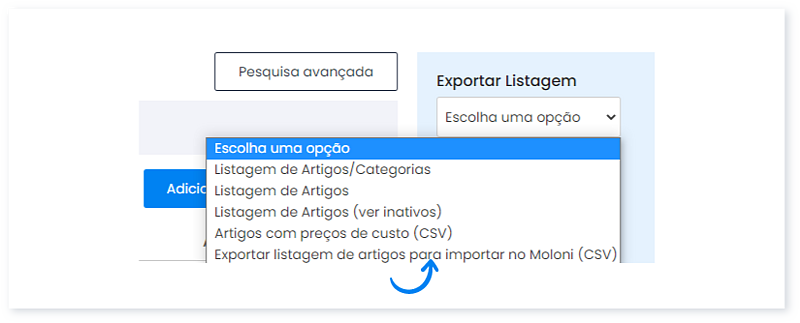 6. Para além de uma listagem em CSV, pode exportar uma listagem geral com todos os artigos para ser importada noutra conta Moloni. Para gerar este documento, escolha a opção Exportar listagem de artigos para importar no Moloni.