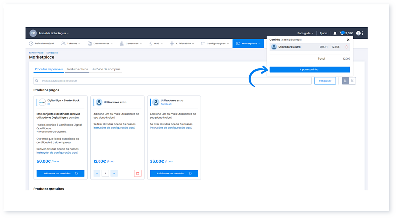 2. Nesta página encontra os produtos disponíveis para adicionar ao seu carrinho. Selecione o produto pretendido clicando no botão Adicionar ao carrinho.