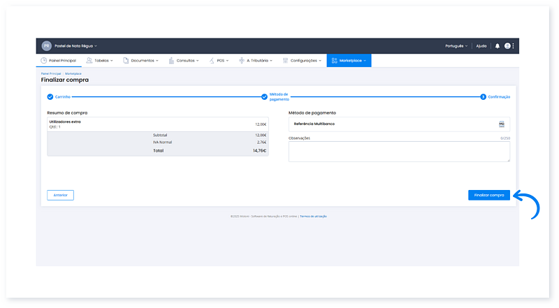 6. É apresentado um resumo da compra onde pode colocar informações adicionais. Clique no botão Finalizar compra.