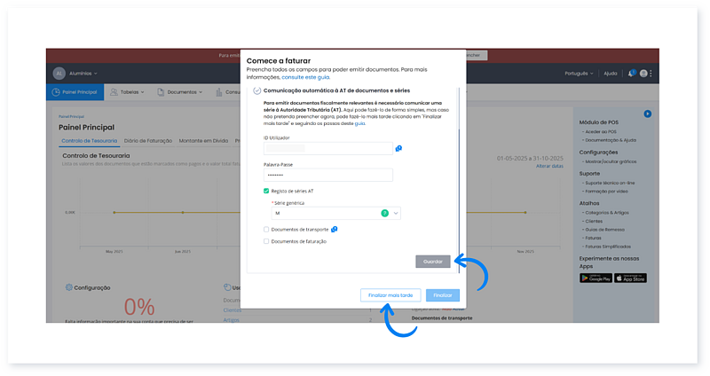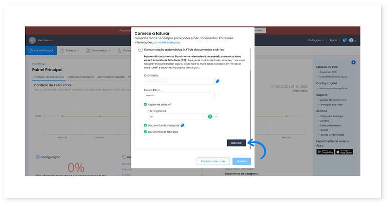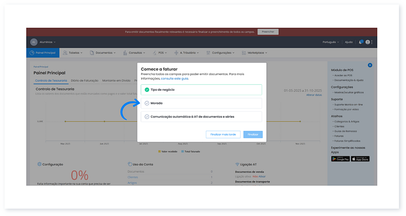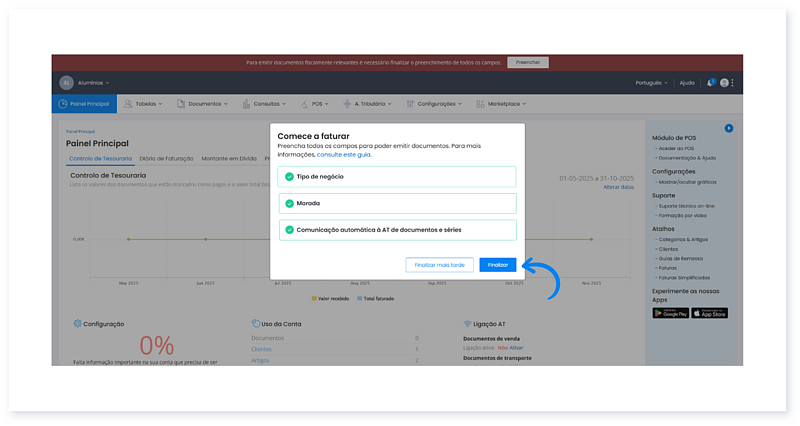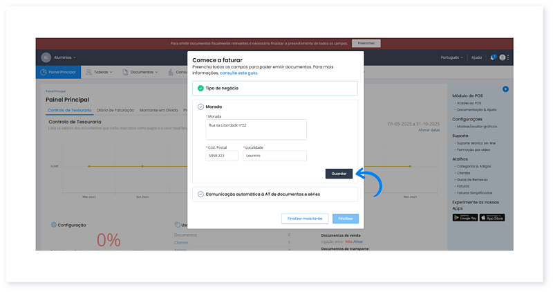 Se não preencher todos os campos solicitados, a configuração fica pendente. Pode guardar os dados já inseridos, clicando em Guardar e Finalizar mais tarde.