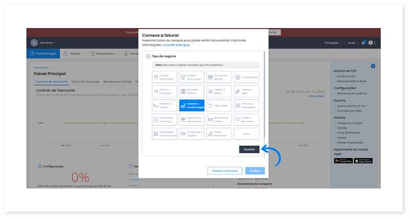 2. Selecione o tipo de negócio e clique no botão Guardar.
