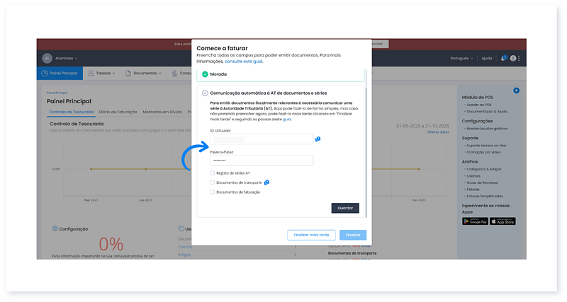 6. Nos campos ID Utilizador e Palavra-Passe, insira o ID do utilizador criado no site da AT e a palavra-passe correspondente.