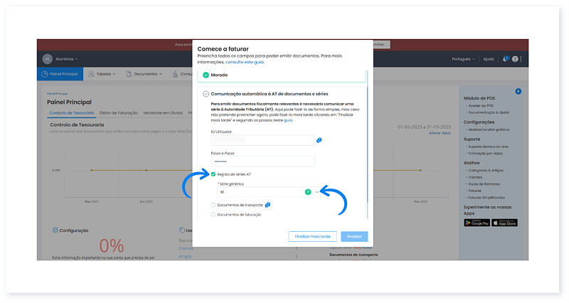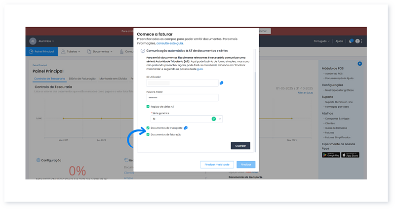 8. Selecione as caixas de verificação Documentos de transporte e Documentos de faturação para ativar a comunicação automática com a AT. O preenchimento destes campos é opcional.