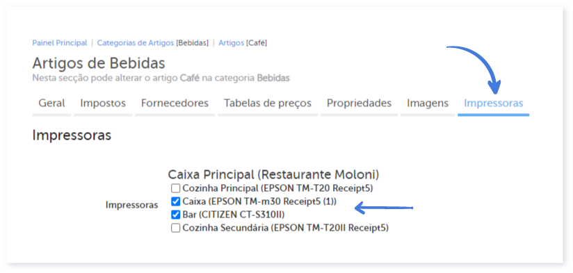 Na Área de Cliente, poderá associar as impressoras através da ficha de detalhe do artigo ou da categoria. Aqui irá encontrar o separador Impressoras.