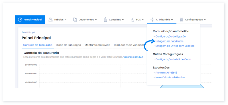 1. Aceda ao menu A. Tributária e clique em Listagem de Pendentes.