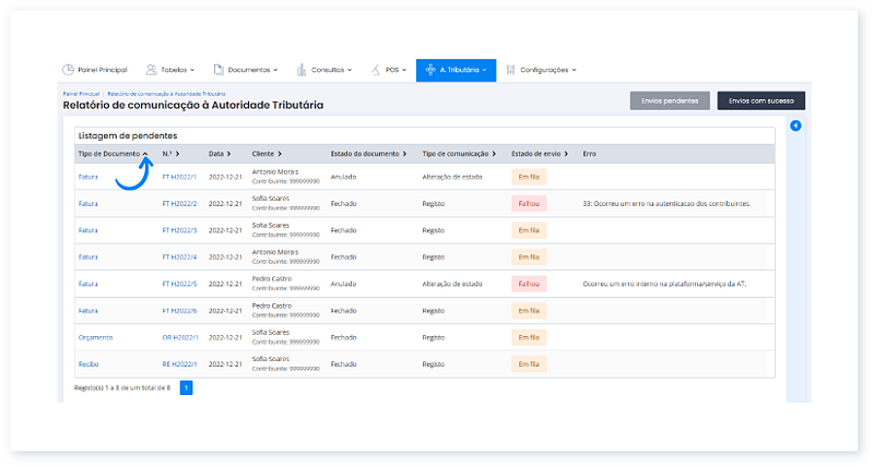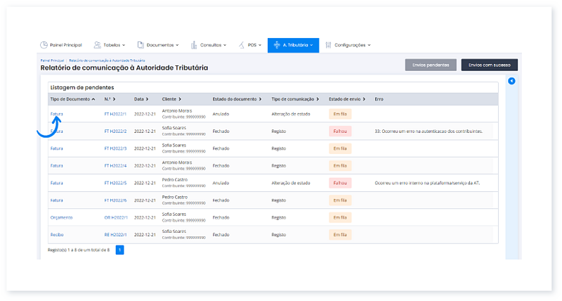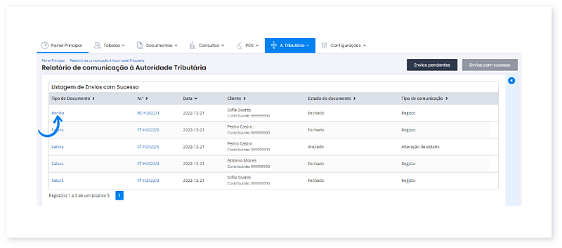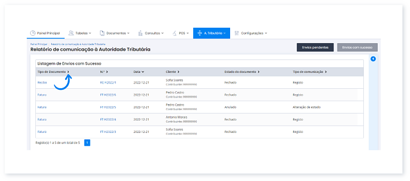 1. Aceda ao menu A. Tributária e clique em Listagem de Envios com Sucesso.