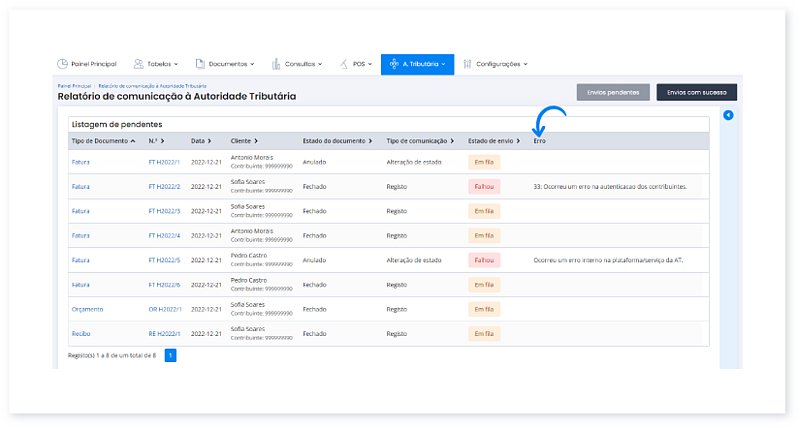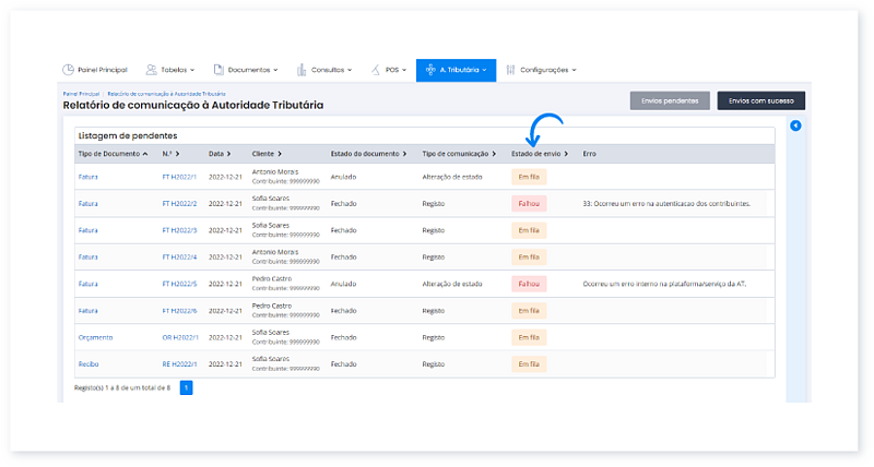 No Moloni pode consultar os documentos enviados à Autoridade Tributária, os documentos com erros ou em fila de espera.