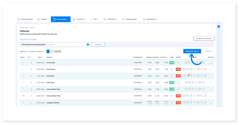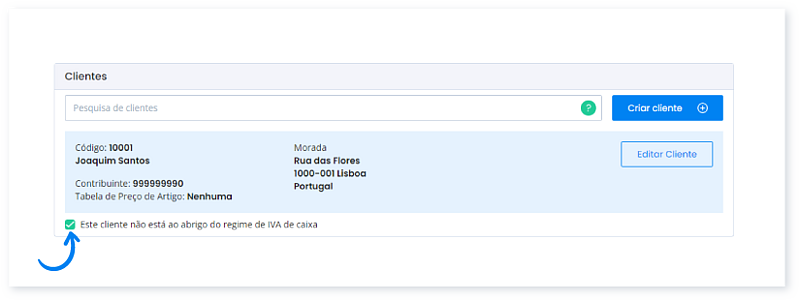2. Pesquise um cliente que não esteja ao abrigo do regime de IVA de Caixa.