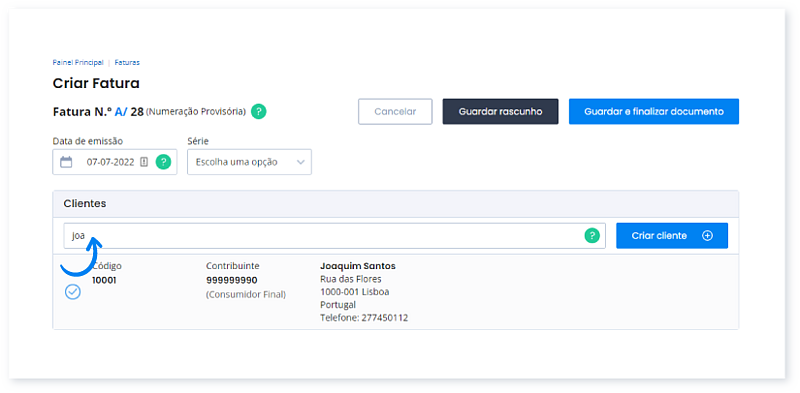 3. As séries de documentos que estão disponíveis para seleção, têm o regime de IVA de caixa ativo. No entanto, é possível ver as outras séries, ativando, no cliente escolhido, a opção Este cliente não está ao abrigo do regime de IVA de caixa.