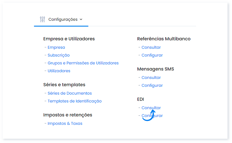 1. Aceda ao menu Configurações, na secção EDI clique em Consultar.