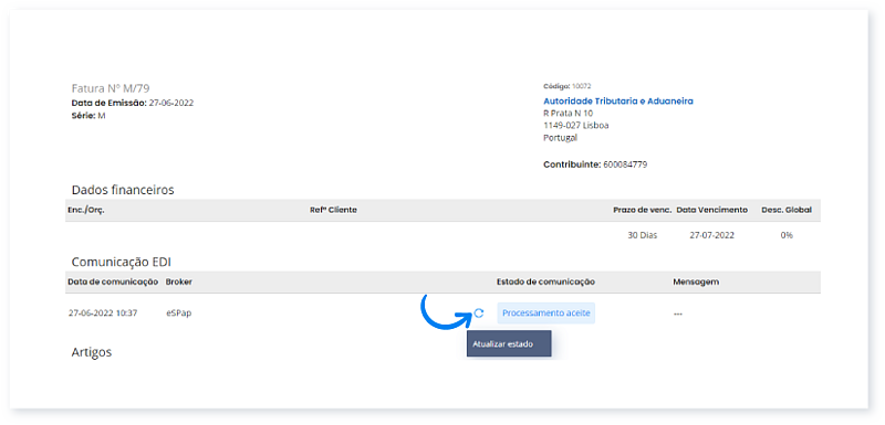 Os documentos comunicados possuem um estado de comunicação. Este estado varia entre os operadores de EDI, podendo ser atualizado pelo utilizador.