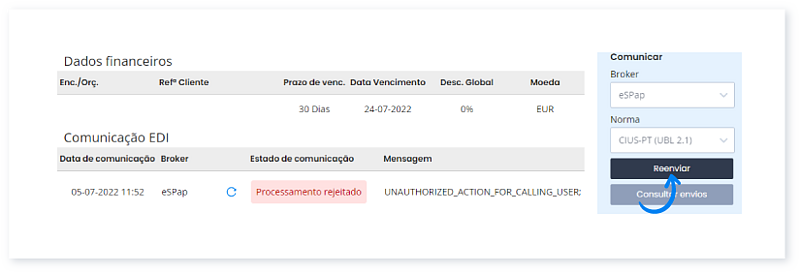 Em alternativa, um documento também pode ser comunicado novamente a partir da listagem.