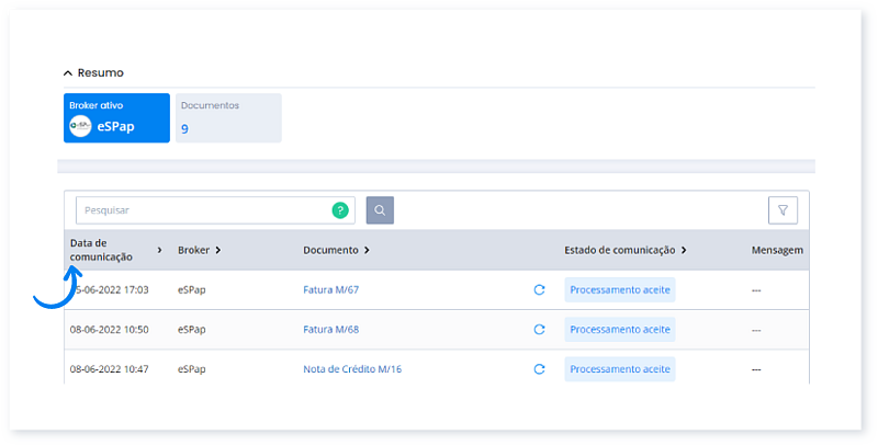 2. A partir desta listagem pode consultar os dados de cada documento comunicado como a data de comunicação, o broker através do qual o documento foi comunicado, o estado de comunicação e uma mensagem associada ao estado de comunicação.