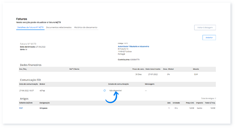 O Moloni também permite que o utilizador consulte a comunicação de um documento a partir da página de detalhe do mesmo: