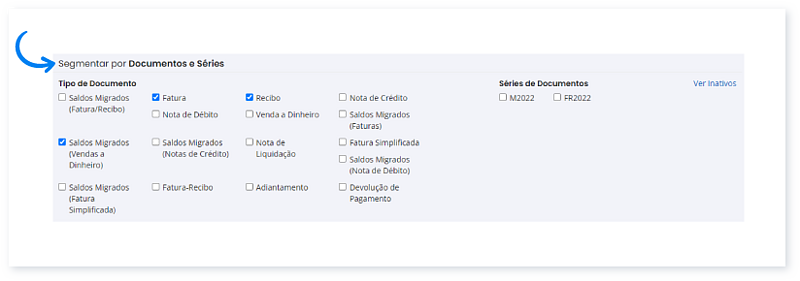 3. Em Segmentar por Documentos e Séries, escolha os tipos de documentos bem como as séries. Pode selecionar as séries inativas, para saber mais consulte este Guia.