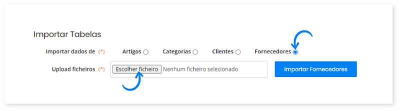 2. Na secção Importar Tabelas ative a opção Fornecedores. Selecione o ficheiro pretendido em Escolher Ficheiro.