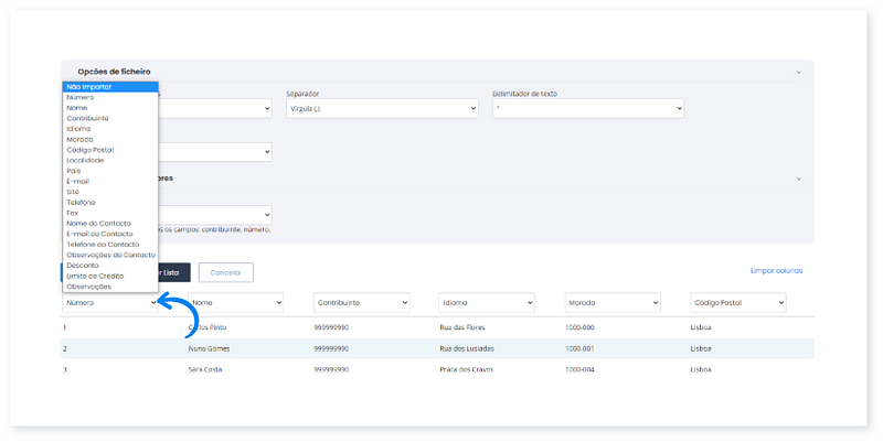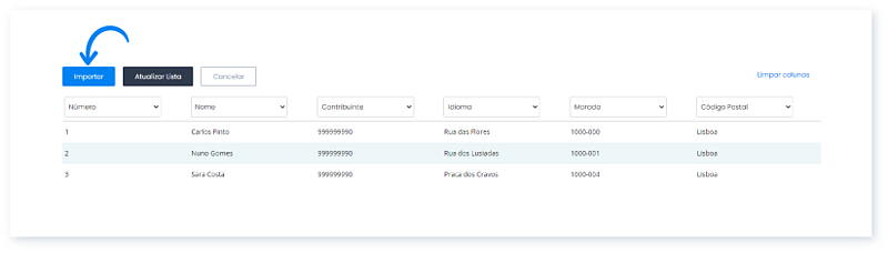 Para que possa efetuar uma importação, deve preparar um ficheiro no formato XLS, XLSX ou CSV , não sendo necessário as colocar colunas por uma ordem específica.