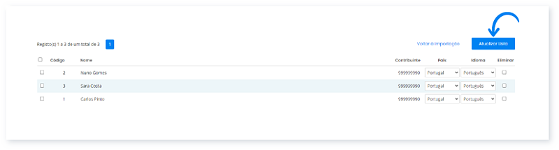 9. Nesta secção verifica se preencheu os campos corretamente. Para efetuar alterações, ative o artigo que pretende e escolha uma opção e clique em Aplicar. Clique em Atualizar lista.