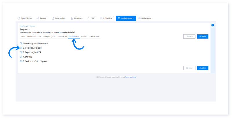 2. De seguida, clique no separador Documentos e em Criação/edição.