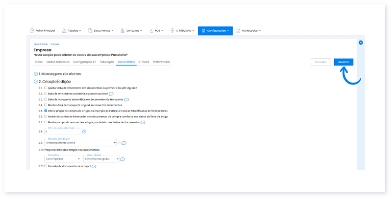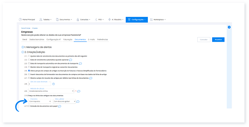 3. Na opção Preço na linha dos artigos nos documentos, selecione as opções pretendidas.