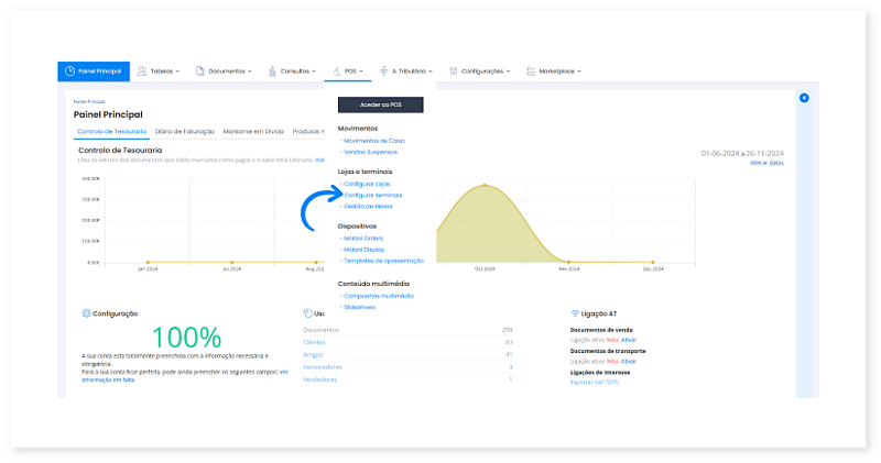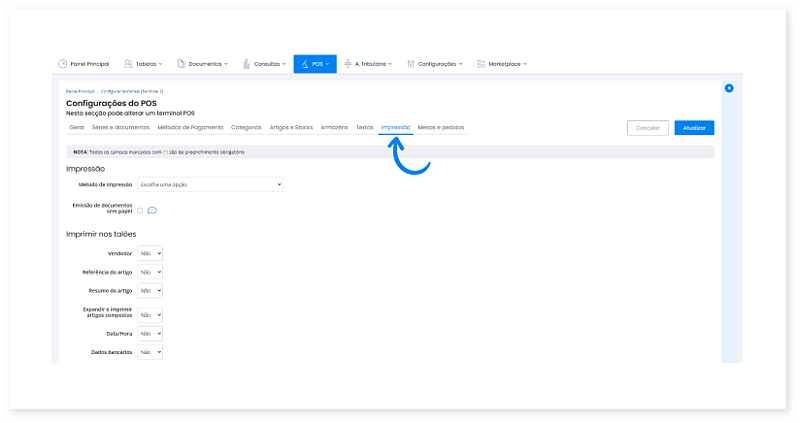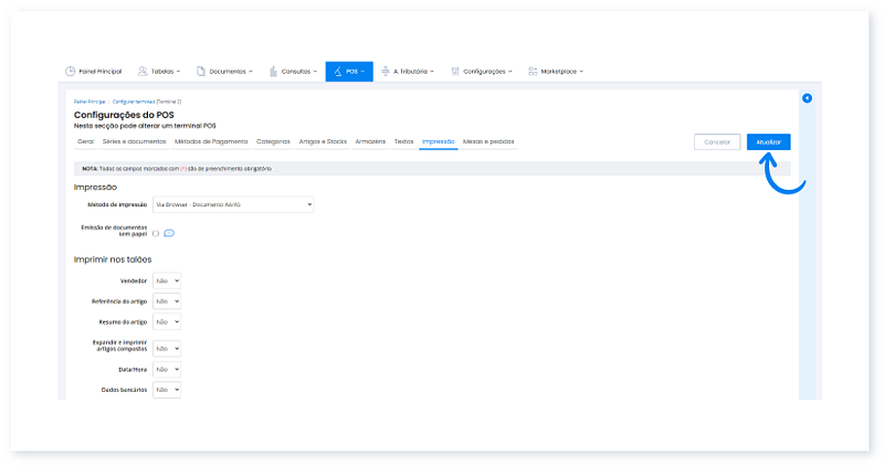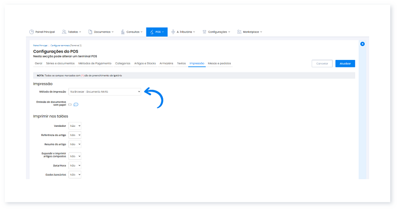 6. Caso pretenda imprimir diretamente do POS para um documento A4 ou A5, selecione a opção Via Browser - Documento A4/A5.