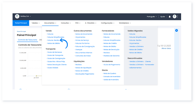 - Para este exemplo, vamos utilizar uma fatura-recibo. No menu Documentos, clique em Faturas-Recibo.