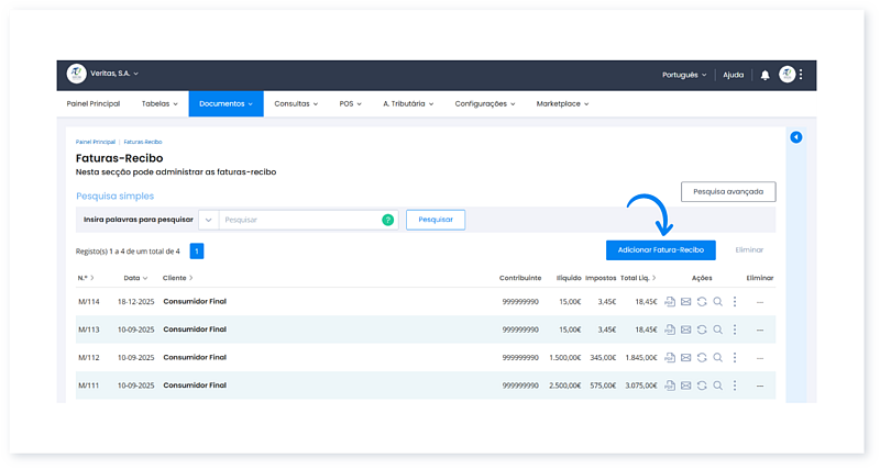 - Clique em Adicionar Fatura-Recibo.