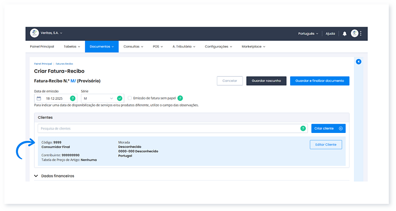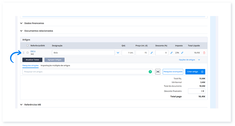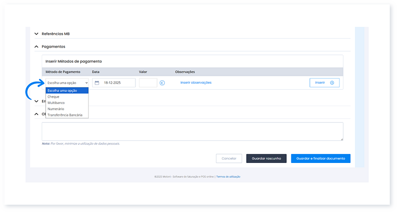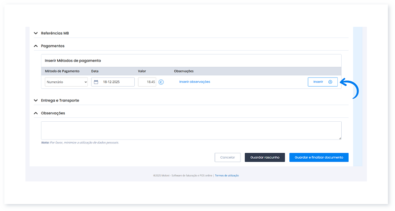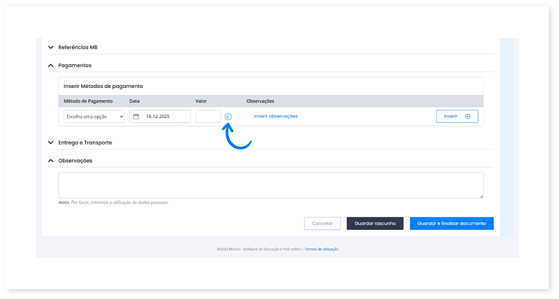- Insira o valor. Ao clicar no símbolo da moeda € é logo preenchido o campo com o valor total do documento.