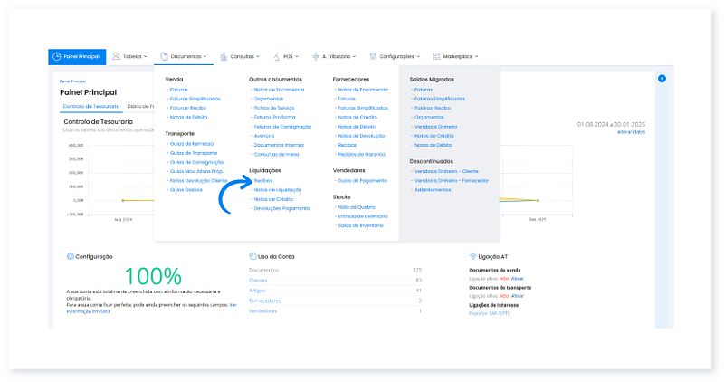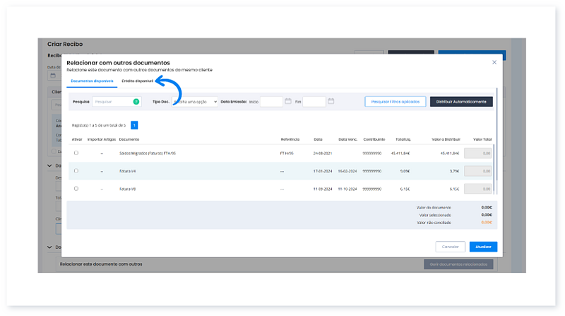 Ao utilizar esta ferramenta de conciliação quando emite um recibo, pode liquidar pendentes de documentos de venda (Faturas) com créditos que ainda existam a favor do cliente.