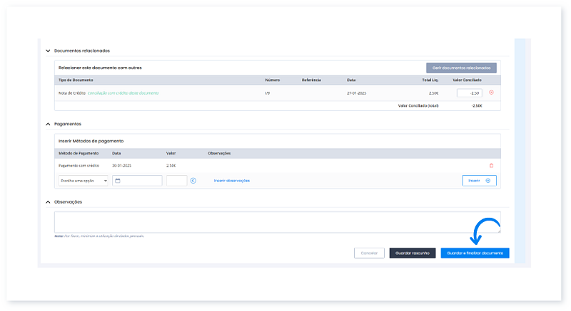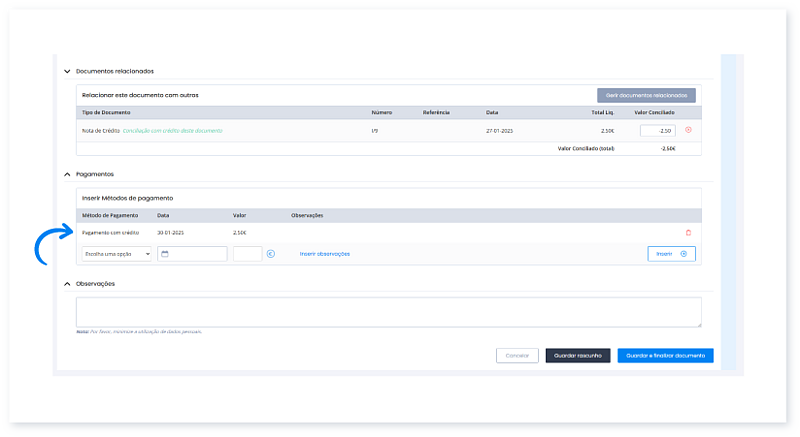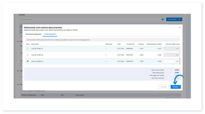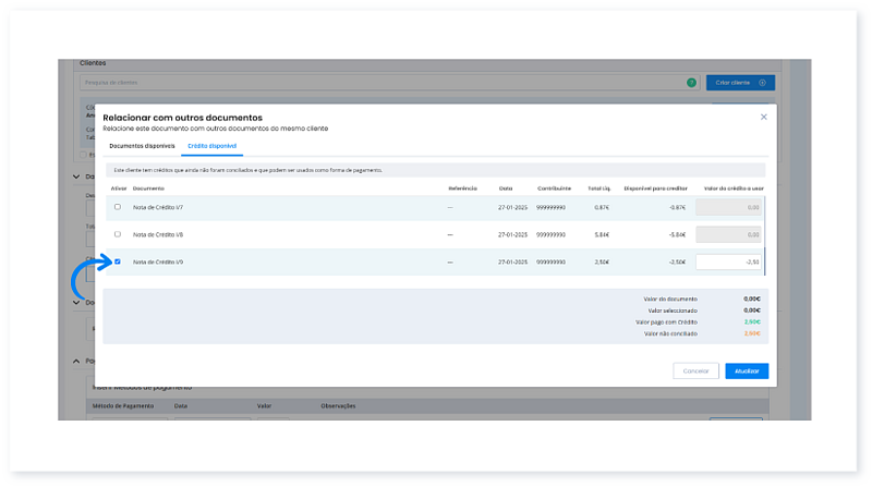 Se pretender, pode modificar manualmente todos os valores de conciliação envolvidos, seja nas notas de crédito ou nas faturas.