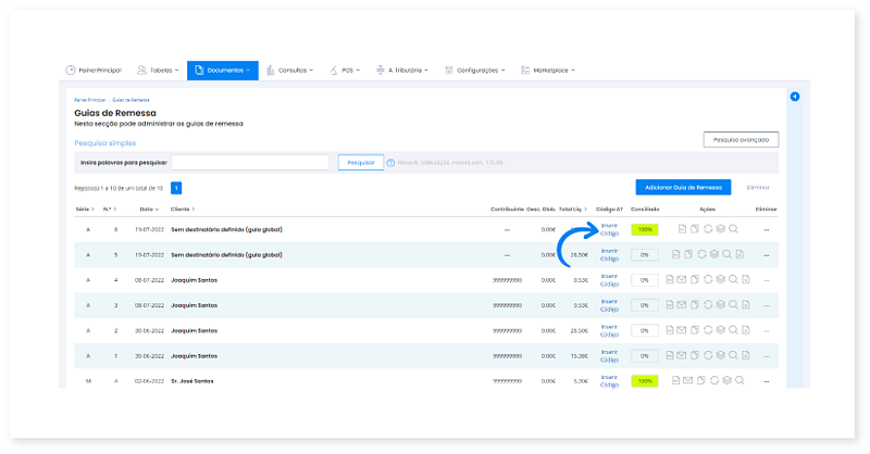 Caso não tenha a comunicação em tempo real à AT configurada ou esta comunicação não esteja a funcionar, pode adicionar manualmente o código do um documento de transporte. Este código deve ser previamente obtido através do serviço telefónico da AT.