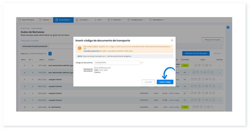 3. De seguida, adicione o código fornecido pela AT e clique no botão Inserir Código.