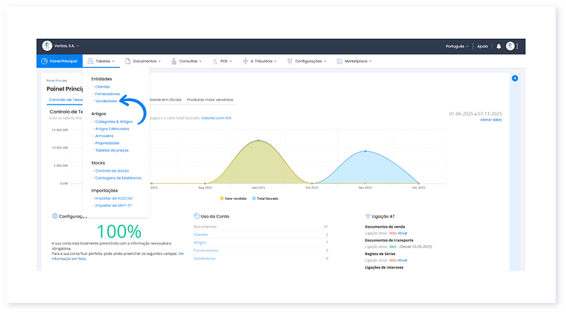 Pode ainda criar vendedores sem um número de contribuinte. O sistema atribui automaticamente o contribuinte correspondente a 999999990 (indiferenciado).