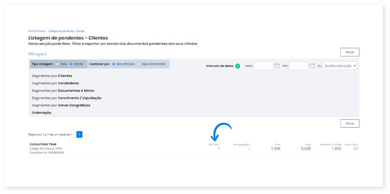 2. Nesta secção, é apresentada uma listagem (por defeito) com todos os documentos pendentes, ordenados por cliente.