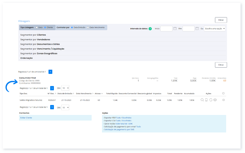 Para além disso, pode gerar um recibo com o valor pendente ou enviar por email uma listagem PDF com todos os documentos pendentes do cliente.