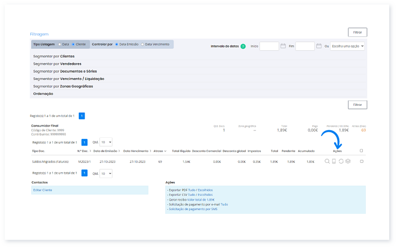 4. Em cada um dos clientes, encontra a coluna Ações com algumas operações para cada documento.