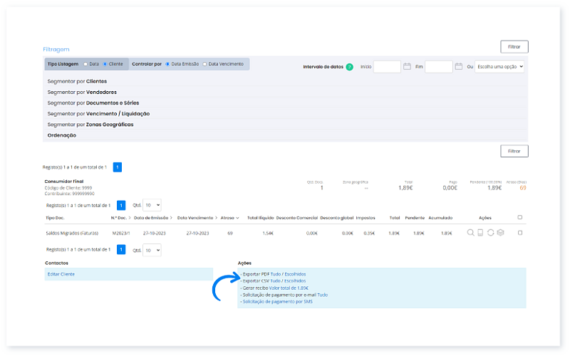5. Pode exportar para PDF ou CSV todos os documentos do cliente ou selecionar os documentos a exportar.