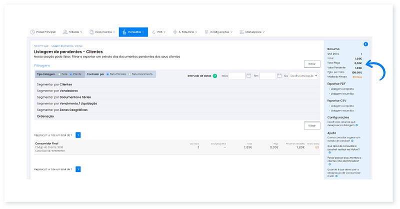 O Moloni permite a consulta de documentos pendentes, permitindo agrupar os documentos por cliente ou fornecedor.