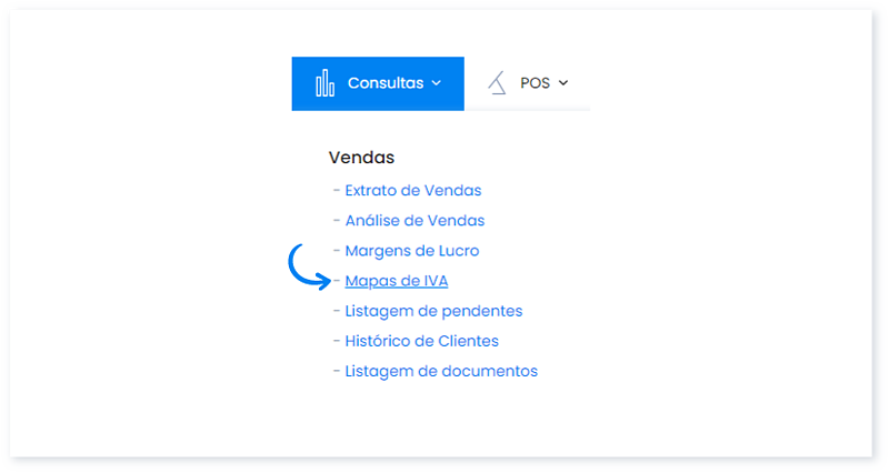1. Para encontrar os Mapas de IVA por tipo de artigo, aceda ao menu Consultas e selecione Mapas de IVA.