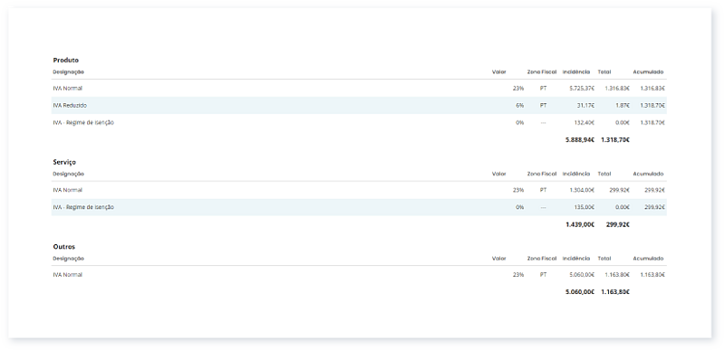 Nesta listagem encontra os valores globais para cada imposto. Contudo, neste tipo de lista, os impostos encontram-se separados pelos tipos de artigos (segundo a classificação para o SAF-T(PT), permitindo uma consulta mais rápida e completa.