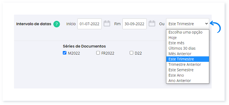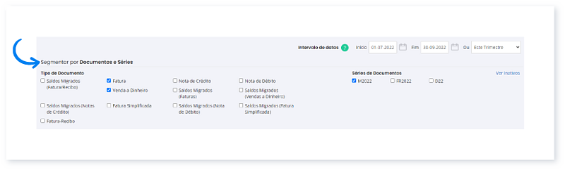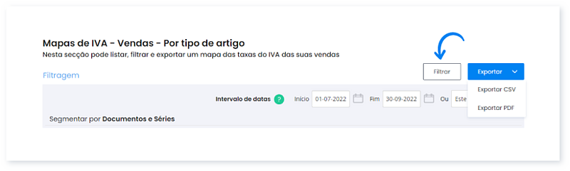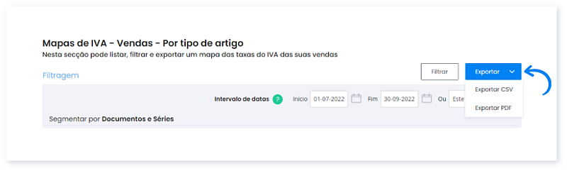 Tal como no Mapa de IVA Global, esta listagem pode ser segmentada por tipo de documento, definir um intervalo de datas ou ser exportada para CSV e PDF.