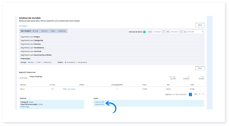 5. Pode clicar em cada artigo da listagem para obter mais informações. Pode também exportar o ficheiro em formato PDF ou CSV.