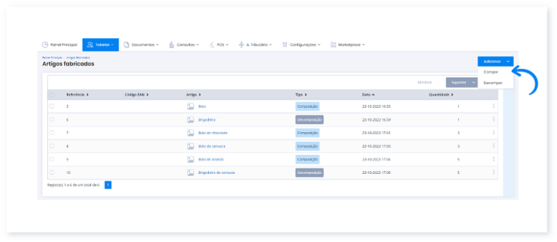 2. Encontra uma listagem com todos os artigos fabricados de composição e de decomposição. Clique no botão Adicionar e selecione a opção Compor.