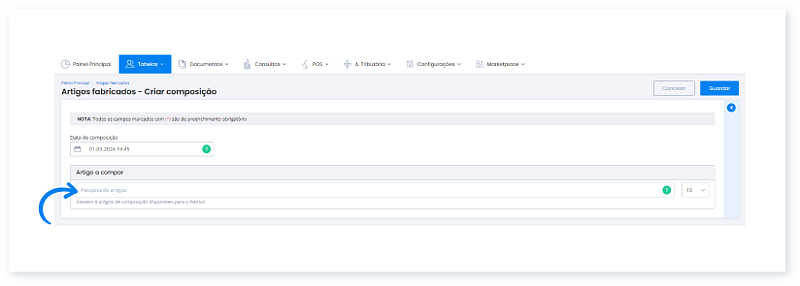 3. Insira a Data do fabrico e pesquise o artigo que pretende fabricar, que deve ser previamente adicionado.
